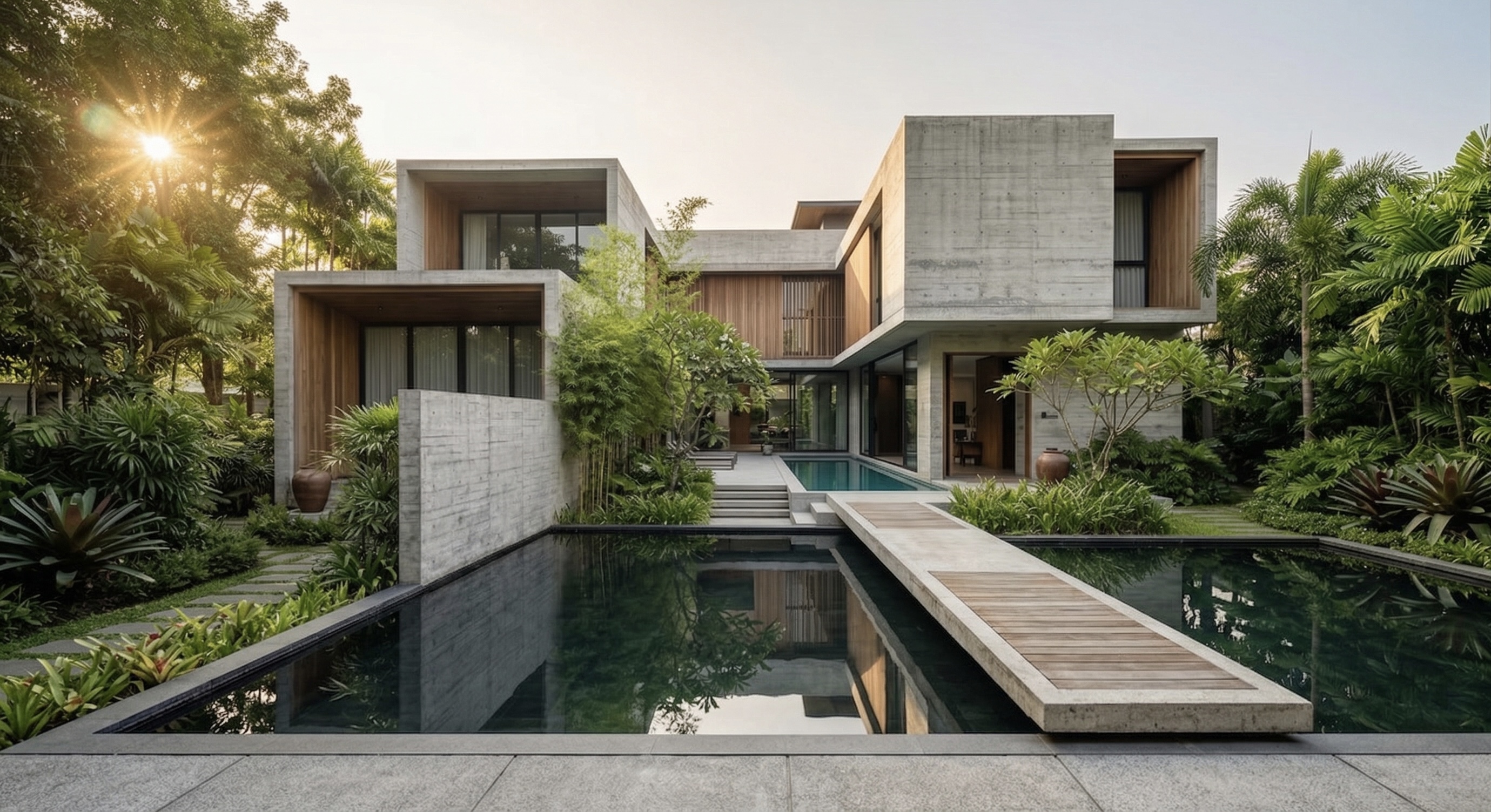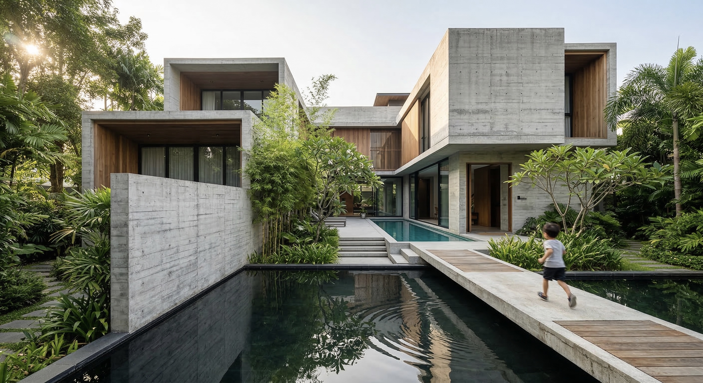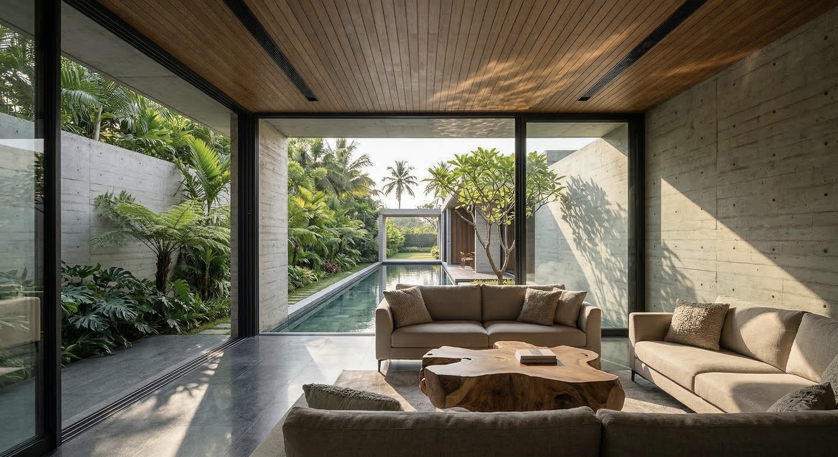 A contemporary tropical villa in raw concrete, warm wood & calibrated natural light. Living, dining, courtyard & terrace volumes create seamless indoor-outdoor continuity. Inward planning ensures privacy, cross ventilation & climate-responsive living.