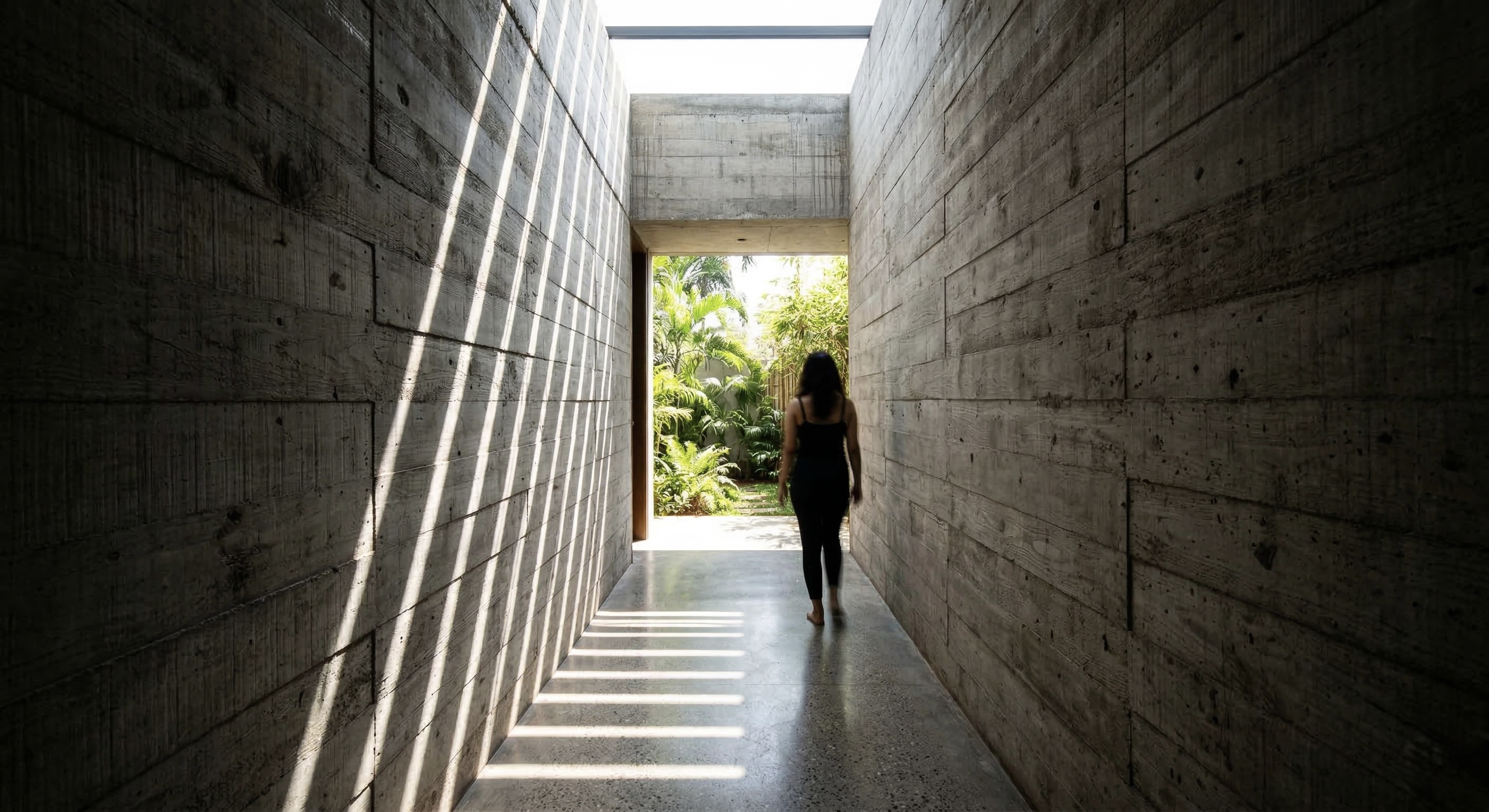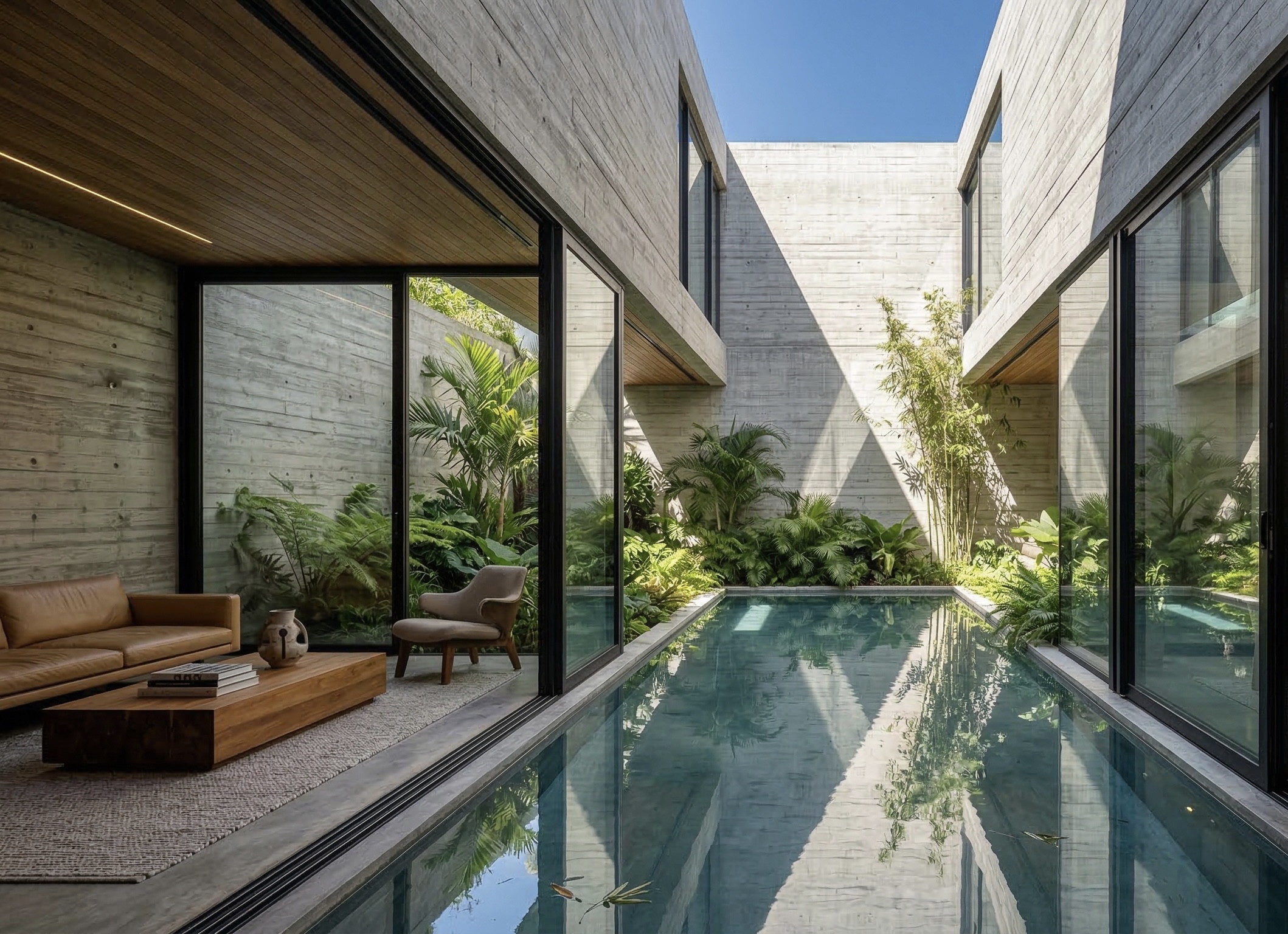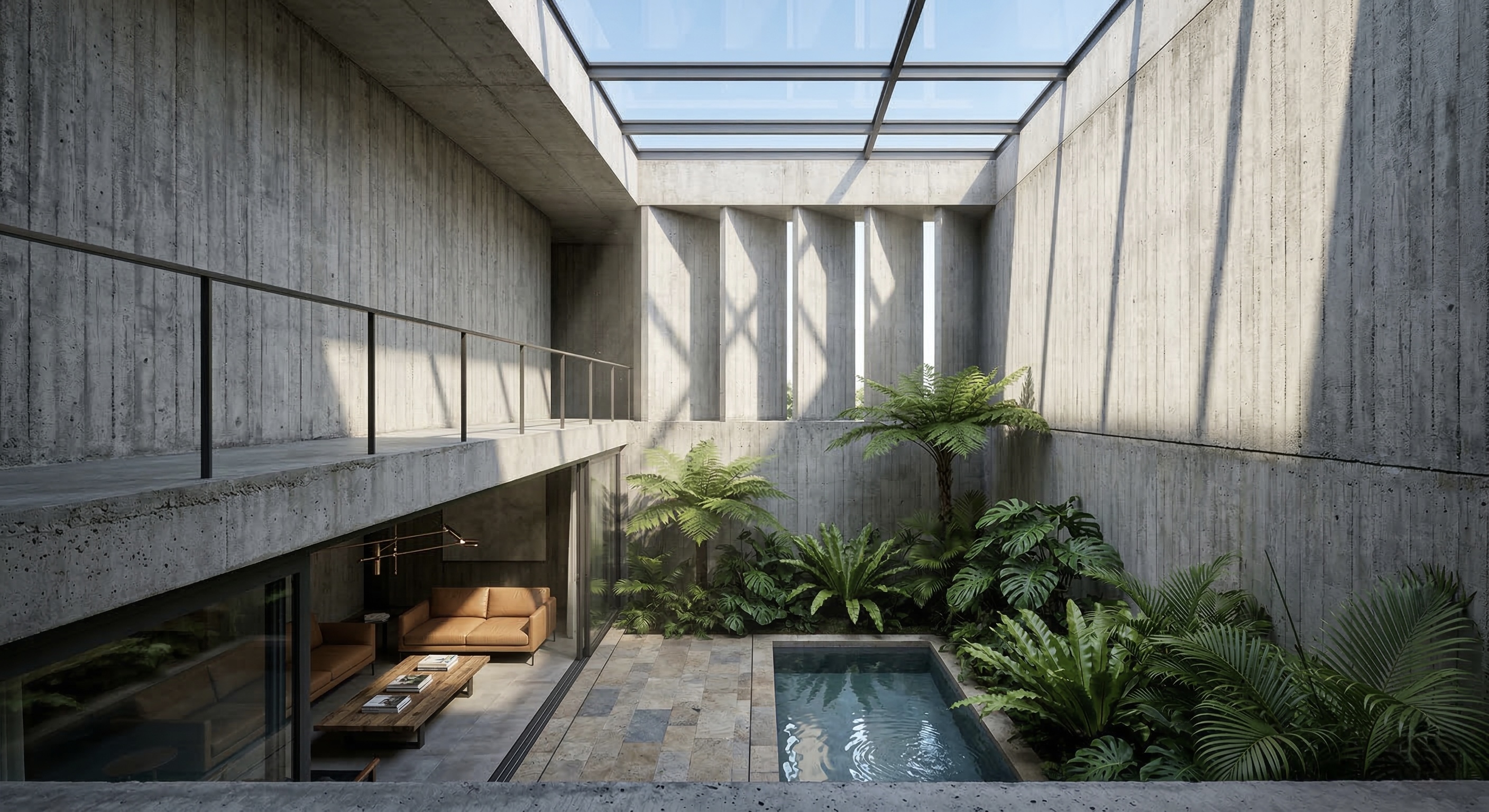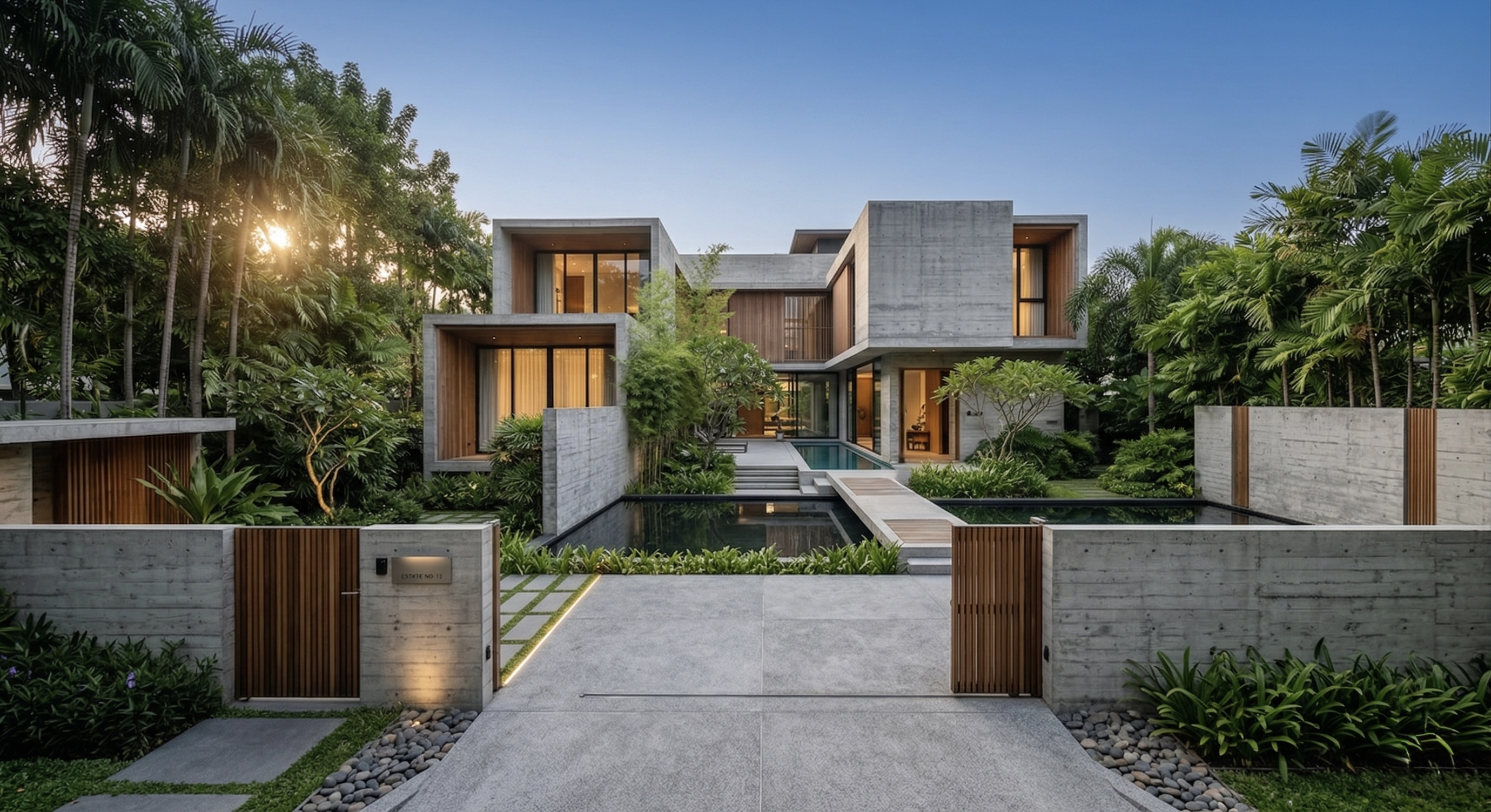A contemporary tropical villa in raw concrete, warm wood & calibrated natural light. Living, dining, courtyard & terrace volumes create seamless indoor-outdoor continuity. Inward planning ensures privacy, cross ventilation & climate-responsive living.
