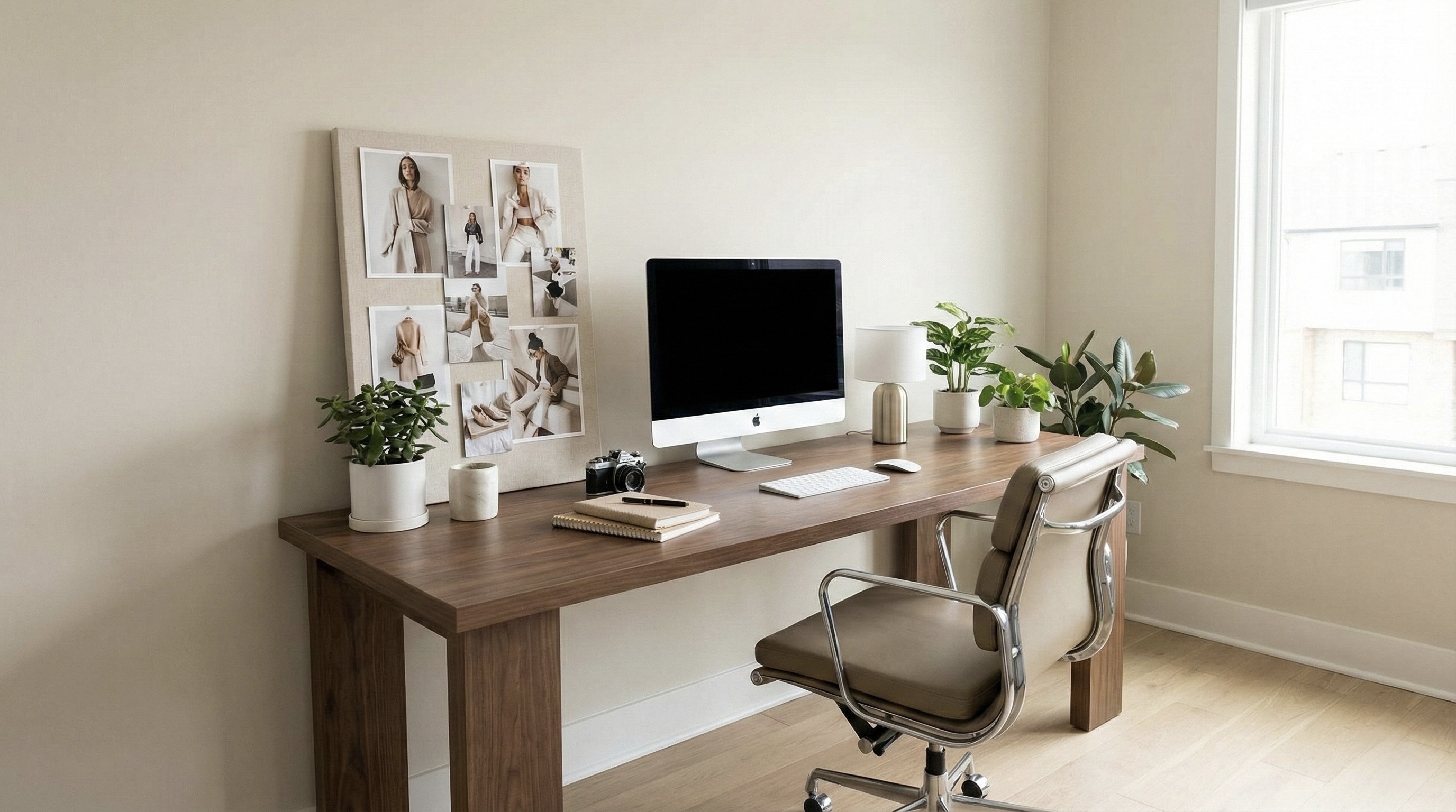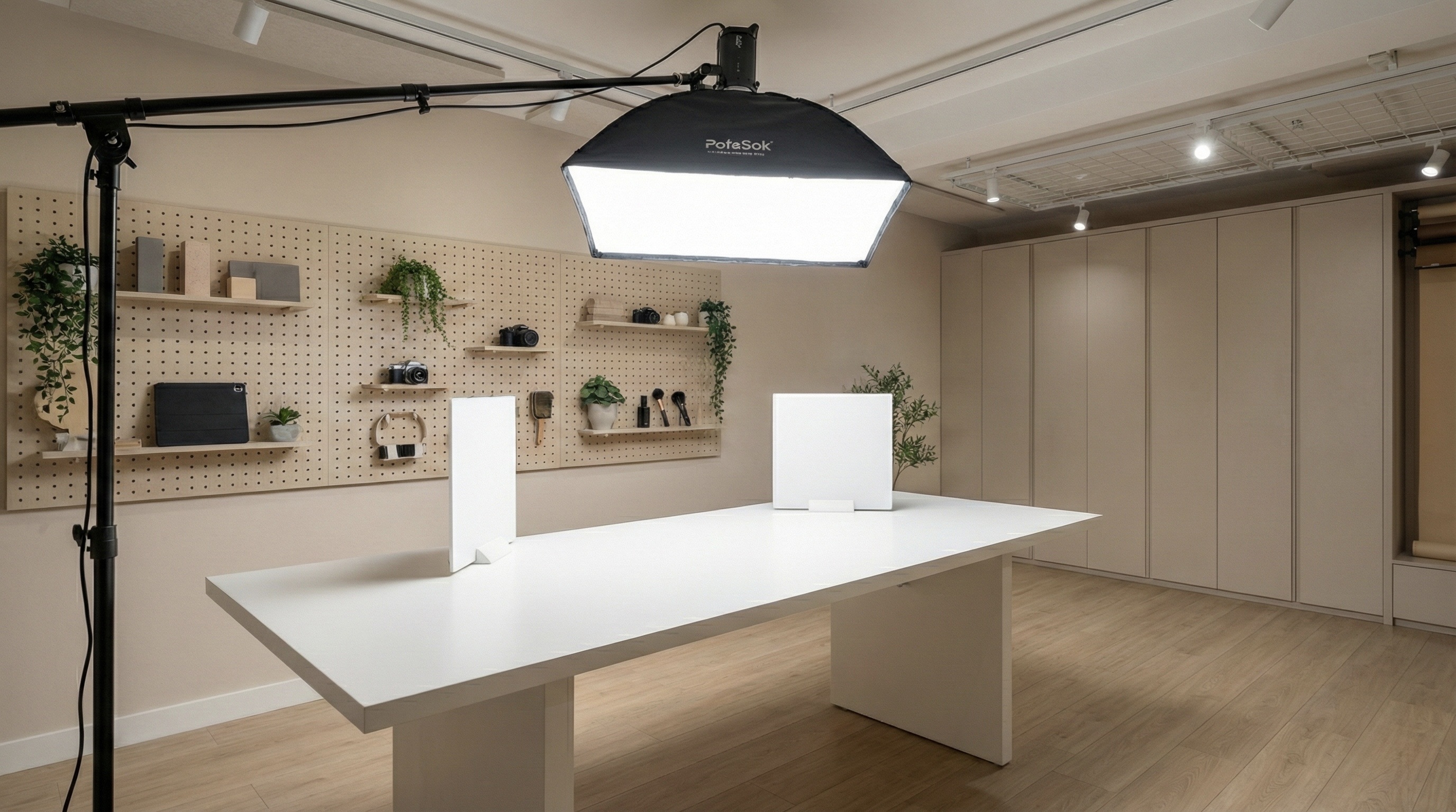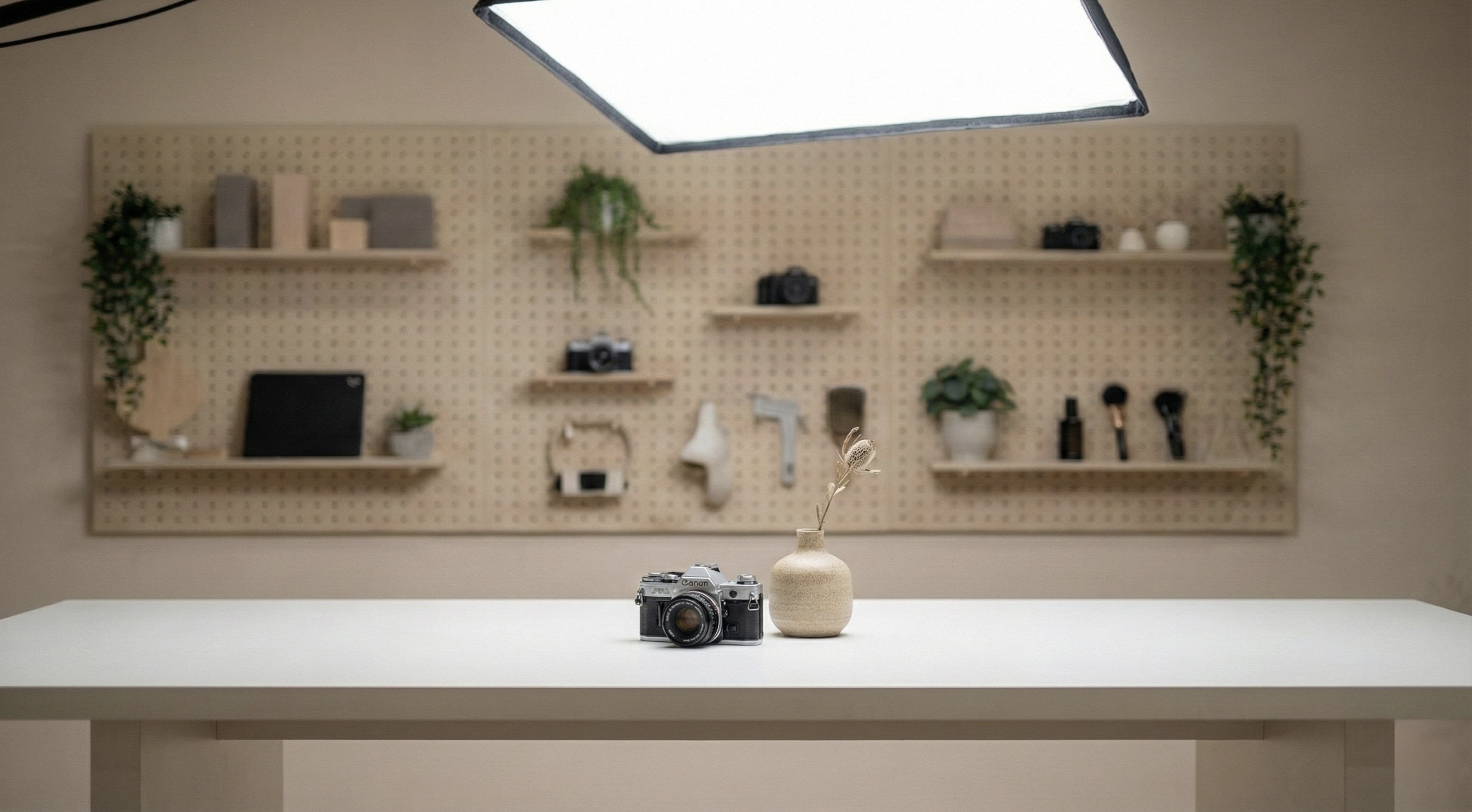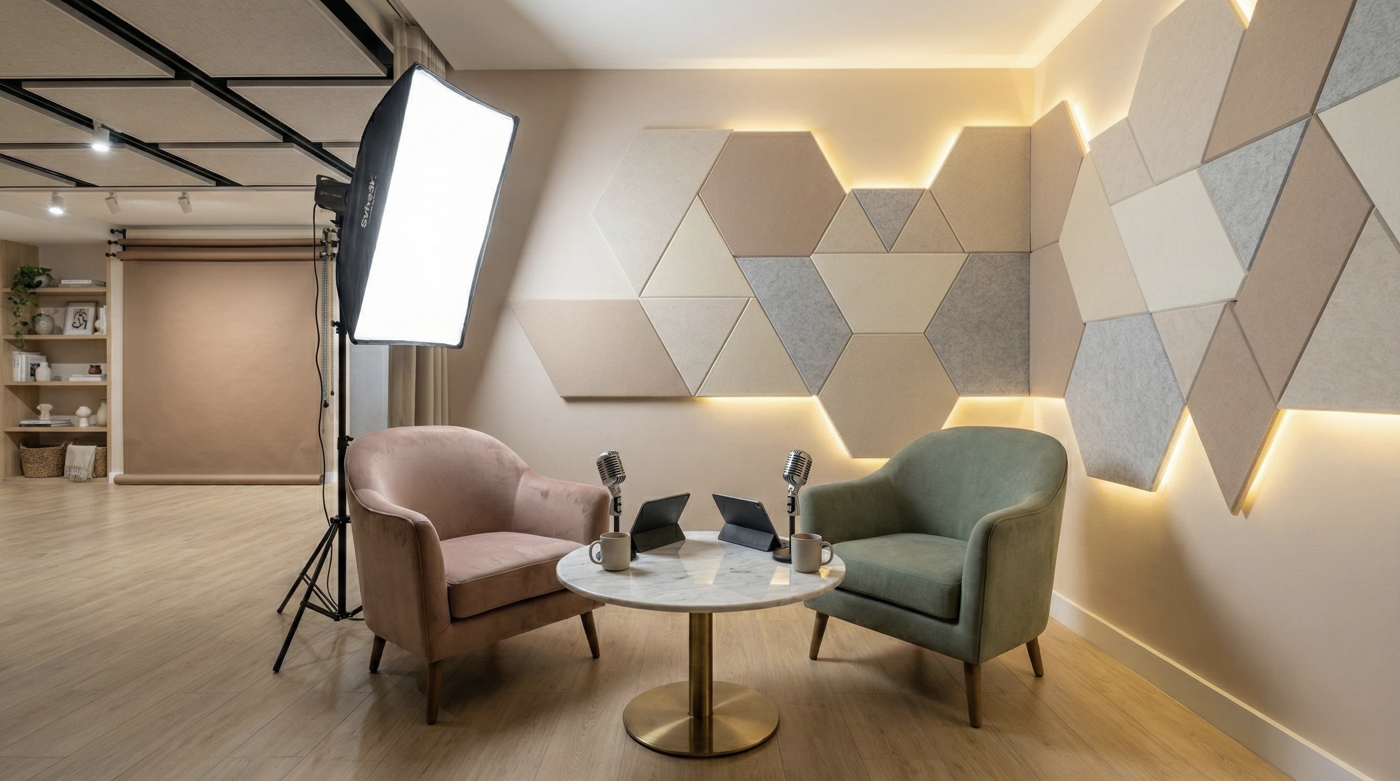 A clean, modern content studio shaped with warm minimal tones and balanced lighting.