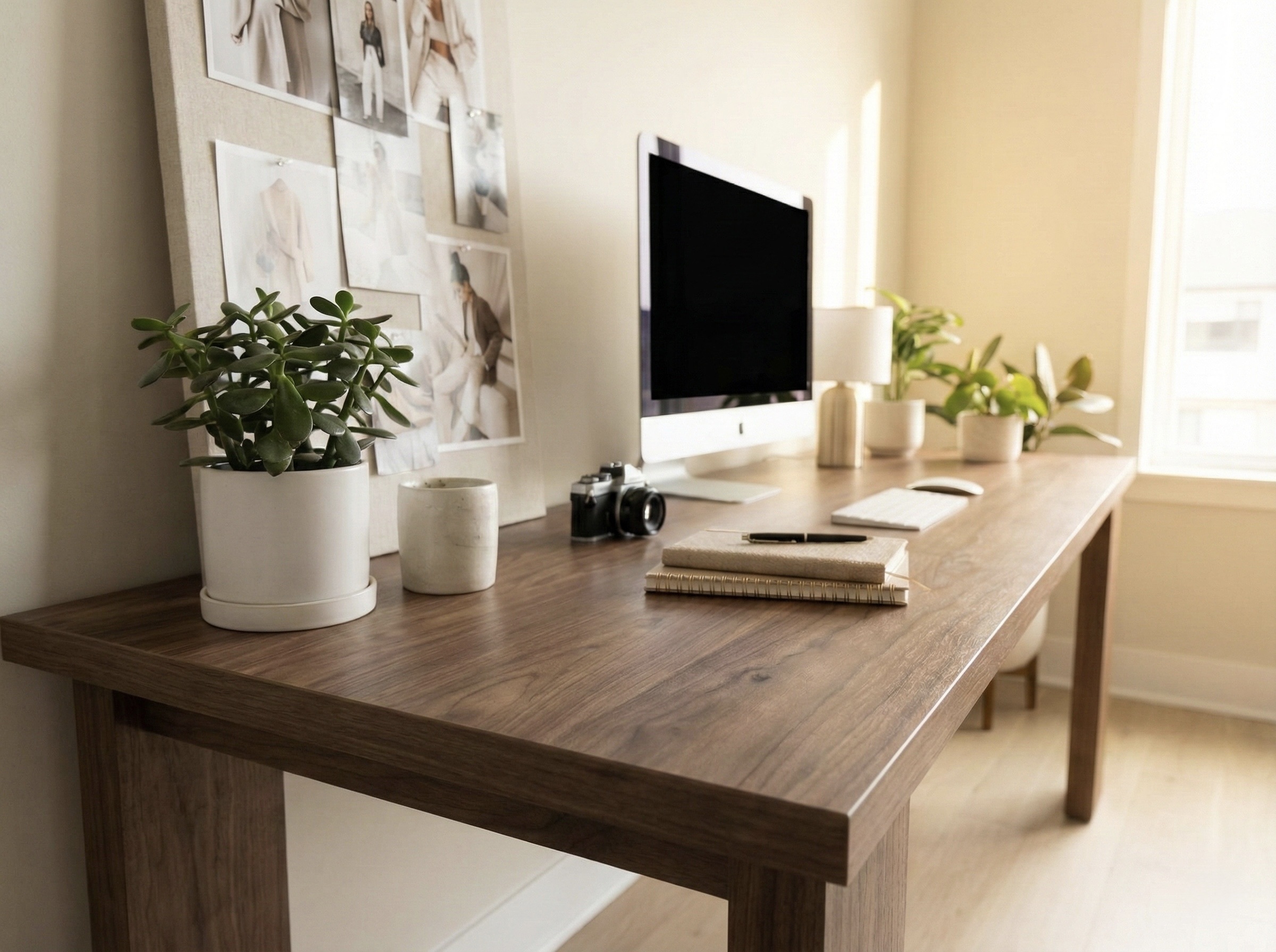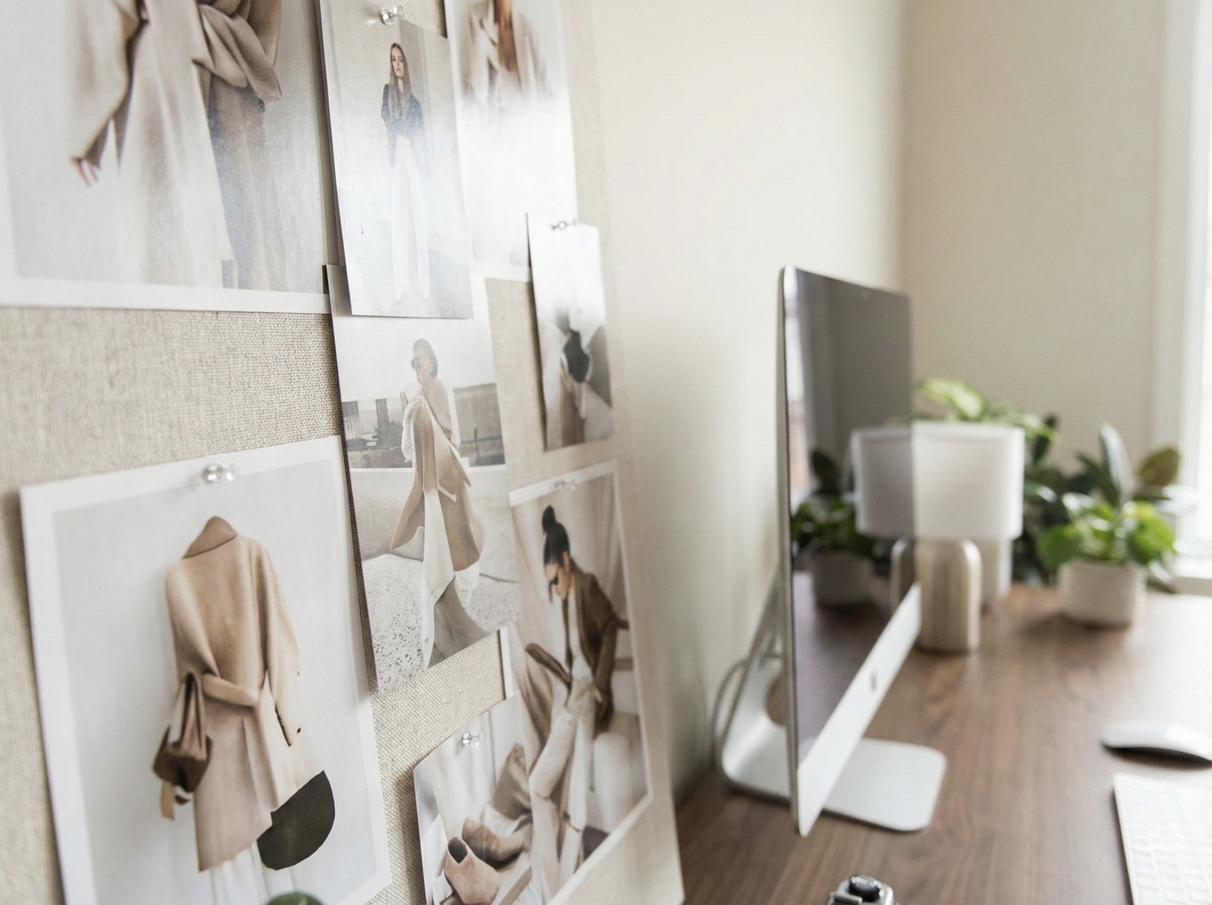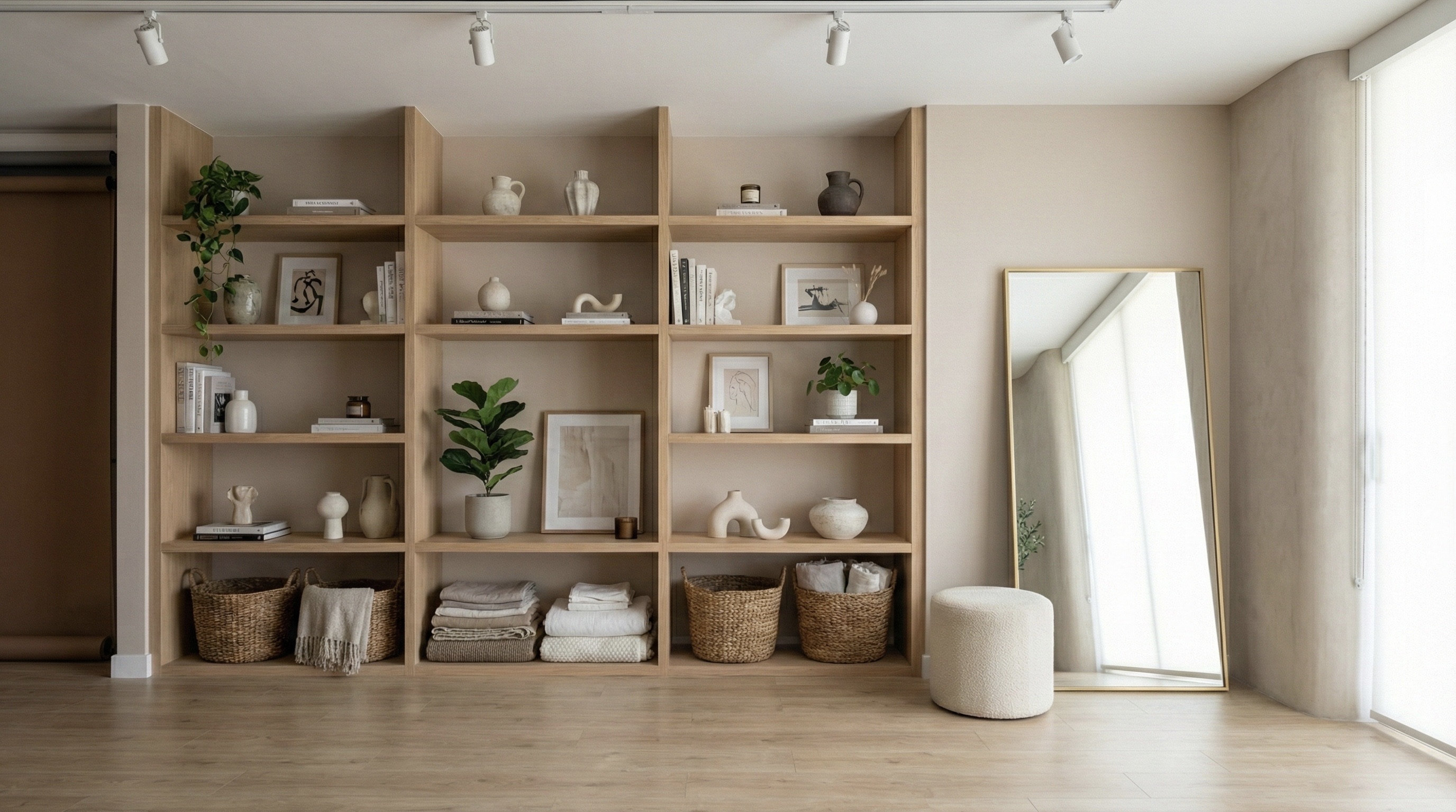 A clean, modern content studio shaped with warm minimal tones and balanced lighting.